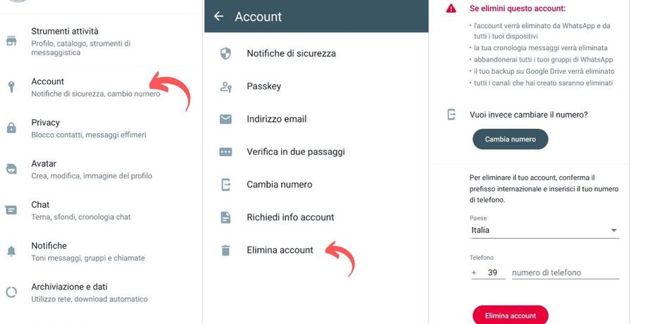 🔔 Tieni presente che l'eliminazione di un account è un'operazione irreversibile, perderai tutta la cronologia delle chat.