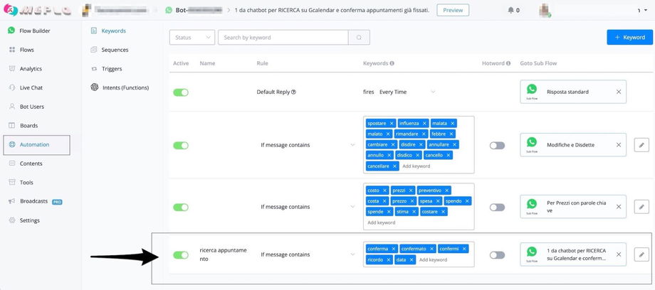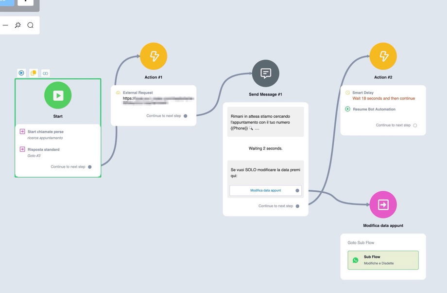 Possiamo configurare, oltre ad un link in chat, delle automazioni sul chatbot per far partire un flusso dedicato. Nel nostro caso a quei clienti che ci chiedono informazioni o conferma delle loro prenotazioni. π