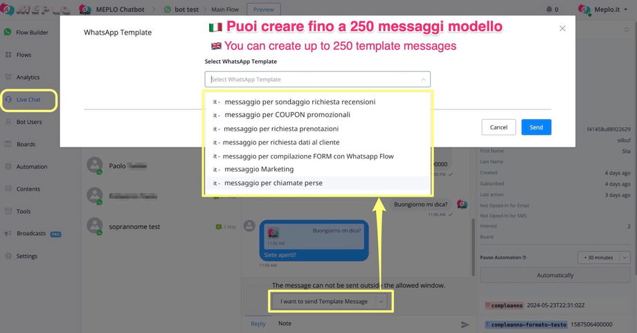 * il primo messaggio automatico inviato π I messaggi modello servono per inviare un messaggio su WhatsApp a un cliente che non è mai stato in contatto con la tua azienda in precedenza o che non risponde a una chat esistente da almeno 24 ore ore. Questi modelli devono essere pre-approvati da WhatsApp per poter essere utilizzati. Si tratta di una regola imposta dalle API di WhatsApp per limitare l'eccessivo spam delle aziende verso gli utenti, e preservare in questo modo l'efficienza di questo canale.